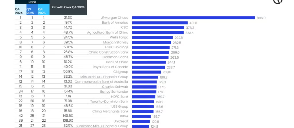 Ринкова капіталізація 25 найбільших банків досягла 6,1 трлн доларів в 4 кварталі 2025 року